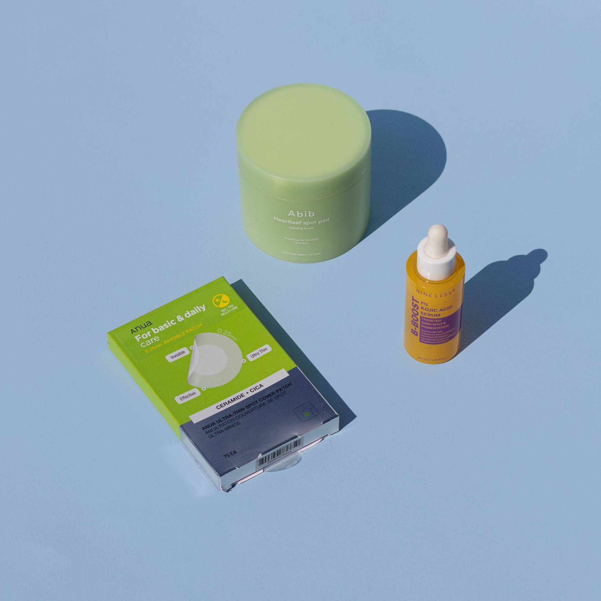 1 serum de Nine Less + 1 pimple patch de Anua + 1 toner pads de Abib